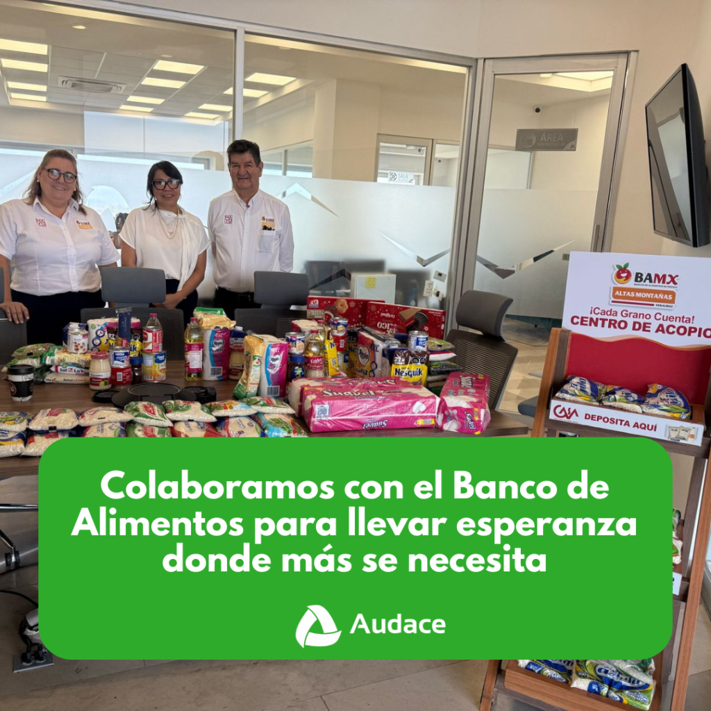 En Grupo Audace creemos que los grandes logros se construyen en equipo. A través de la generosa participación de nuestras y nuestros colaboradores, realizamos entregas de arroz, frijol, lentejas y otros productos de la canasta básica al Banco de Alimentos de las Altas Montañas.